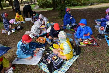 お昼ご飯のお弁当は、感染症対策のため間隔をあけて食べました。食後のおやつも食べてお腹いっぱいになった様子でした。
