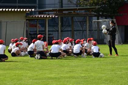 次は、ドリブルの練習です。「ホイッスルが鳴ったら、ボールを止めて静止してみよう!」この練習でも、「ピタッと止まることができたよ」「動きそうになってしまった」等、普段の体育では味わえない体の動きを学びました。