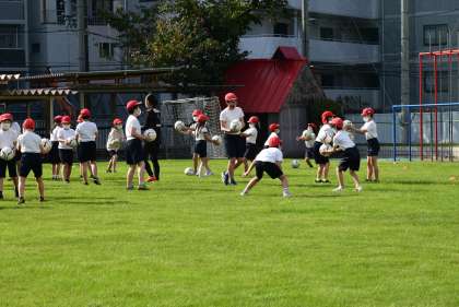 序盤は、「ボールを2個使って、5秒間持ちこたえてみよう!」コーチからの的確な指示に、子どもたちも無我夢中でついていきます。「難しい」「できた!」目を輝かせながら取り組みました。