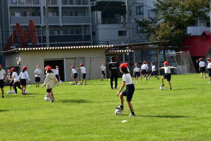 セレッソ大阪から、4年生にサッカーコーチの派遣がありました。「夢授業」と題して、2時間目・3時間目を使い、基礎的な練習や試合形式を学びます。