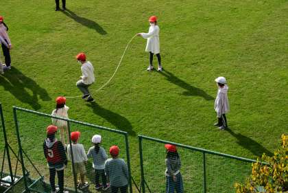 運動場では、スポーツオセロや川わたりの活動をします。子どもたちは、久しぶりにたてわり班で体を動かす気持ちよさを味わっていました。