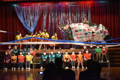 衣装や小道具も子どもたちが制作したものを中心に取り入れ、高学年部の職員も子どもたちと同じように全員マタンプシを身にまといました。