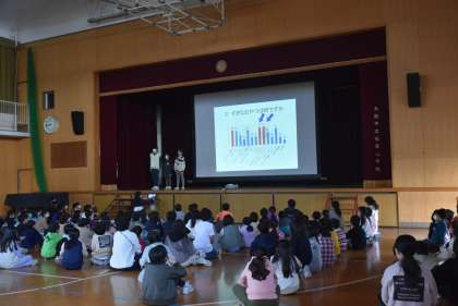 発表の終わりでは、よくかむための替え歌を紹介しながら全校児童で歌い、今日の給食時から実践していくことを約束しました。