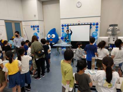 初めに、淀川から取水する仕組みや水の汚れを取り除く仕組みについて、ガイダンスの方に施設を巡りながら説明いただきました。まだ汚れが残っている状態の水から、きれいな飲み水へと生まれ変わっていく様子を見て、子どもたちは息をのんでいました。