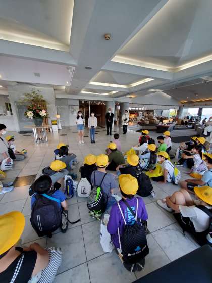 お世話になる宿舎に到着しました。開舎式で宿舎の方にご挨拶をしたり宿舎での過ごし方を確認したりしました。宿舎の皆様、どうぞよろしくお願いします。