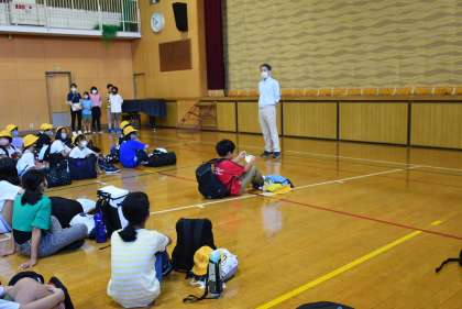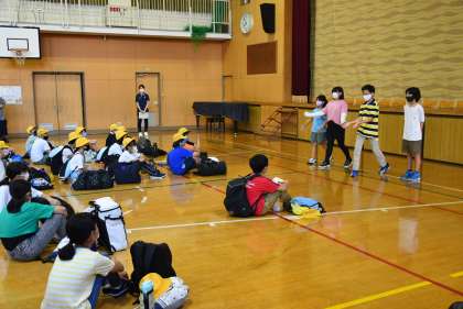 代表の児童は、今回の自然体験学習のめあてを確認し、みんなの前で立派に出発のあいさつをすることができました。