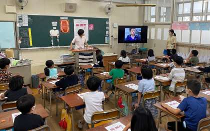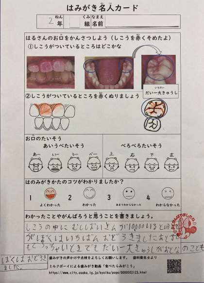 そのあと、それぞれの教室に戻り、子ども達は歯科衛生士さんによる歯みがき指導を受けました。むしば菌や歯垢のことなど初めて知ることができ、歯みがきが楽しみだと感想をもった子どももいました。