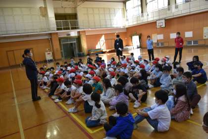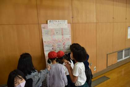 「お花屋さん」や「交番」等、自分たちが行った施設の紹介について、1年生に分かりやすく説明しました。紹介するためのセリフをしっかりと覚え、身振り手振りやクイズを交えて発表する2年生の姿に、1年生も真剣な表情で聞いていました。