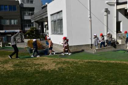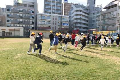 今回は、休み時間中に地震が起こるという想定でした。運動場や講堂でみんな遊びをしている子どもたちは、安全を確保するために運動場の中央に避難しました。