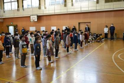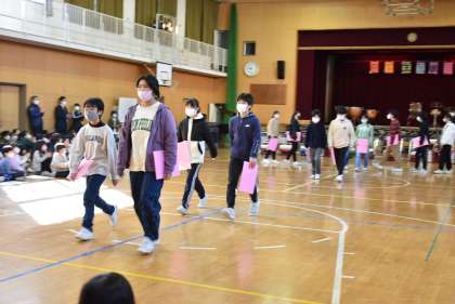 本日朝の1時間目の時間に、3年ぶりとなる「6年生を送る会」が開催されました。会長・副会長を中心に、運営委員の子どもたちが司会進行を務め、全校児童が一斉に介する形式で開催することができました。