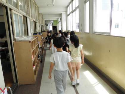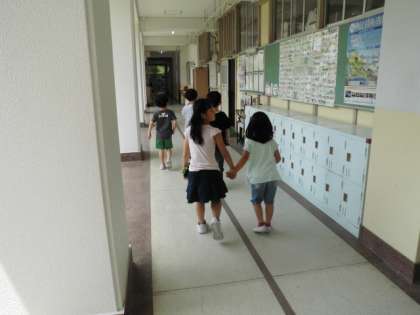 お互いに自己紹介をし、列になったり、2年生が1年生の手を引いたりして楽しく学校内をたんけんすることができました。
