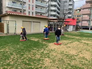 美化委員会(芝生サポーター)が8時10分から約10分間、教師付き添いのもと、エアレーションの作業をしています。