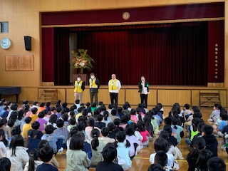 その後、全校朝会で天王寺警察・区役所の見守り隊の方に学校と地域の安全についてお話ししていただきました。