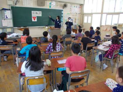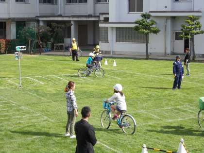 11月5日(木)天王寺警察署や天王寺区役所の方々にお越しいただき、4年生を対象に自転車講習会が実施されました。講義では、自転車の交通ルールについてお話をしていただき、その後DVDを視聴して教えてくださったことを確認しました。実技では、実際に運動場で自転車に乗って、信号のない交差点や駐車車両の横を通る時などの通行の仕方を体験することができました。