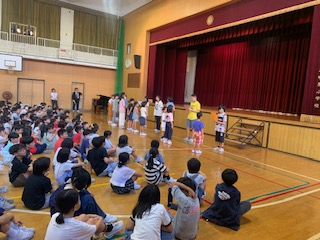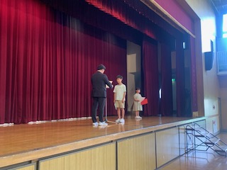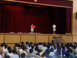 2年生と5年生が1学期を振り返って、全校児童の前で作文発表をしました。
