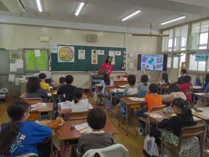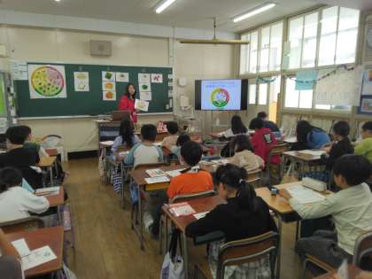 10月31日(木)、4年生はヤクルトからゲストティーチャーに来ていただき、「おなか元気教室」を行いました。毎年この時期に来ていただいて、腸のはたらきや「早寝早起き朝ごはん」の大切さを教えていただいています。今年は「腸内フローラ」の話や「赤・黄・緑」の3色の栄養について教えていただきました。普段食べている食事は3色バランスよく取れているか振り返るよい機会となりました。