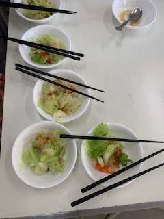 ニンジン、ブロッコリー、キャベツをゆで、自分たちで作ったソースをかけて、試食しました。