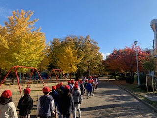 昨日交流した5歳児に、葉っぱのプレゼントをしようということになり、お気に入りの葉っぱを探しています。