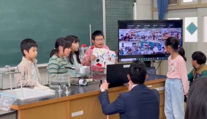 味原小学校と東京学芸大学附属小金井小学校、川崎市立日吉小学校、川崎市立下河原小学校の4校の4年生で、「空気の温度と体積の関係」について合同で学習しました。