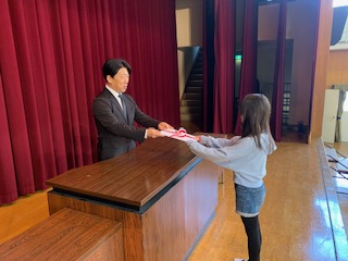 校長先生から、5年生の代表児童に修了証が授与されました。