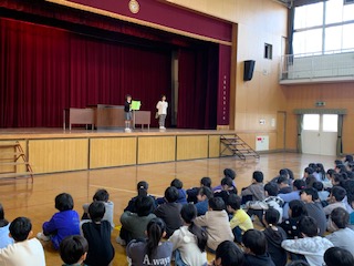 また、1年生と4年生が自分の思いや考えをまとめた作文を全校児童の前で発表しました。