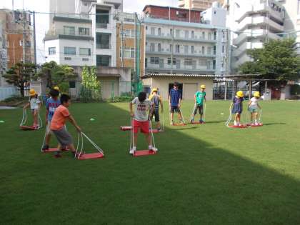 7月に入って朝の時間に、美化委員を中心として「エアレーション」の芝生作業を行っています。梅雨の季節になり雨が多く、地表にコケ状のものが増えてきました。そこで、「エアレーション」を行い、地中に水や空気を行き届かせるようにします。芝生の運動場の手入れを子ども達が自主的に進めています。