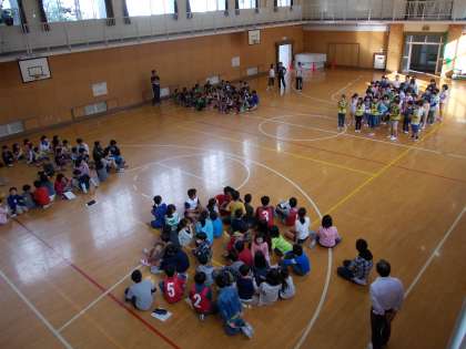 そのあと、たて割り班の色別に歌合戦を行いました。どの色のチームも児童会の歌と集会委員会が決めた歌を元気に歌うことができました。