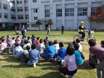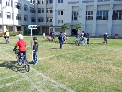 11月16日(水)4年生を対象に、天王寺警察署の交通課の方による自転車講習会が実施されました。はじめに教室で自転車の乗り方、交通ルールについての講義を受けました。次の時間は、運動場で、交差点や横断歩道、障害物横の通り方などを教えていただきました。全員2回ずつ自転車に乗って実技コースをまわりました。