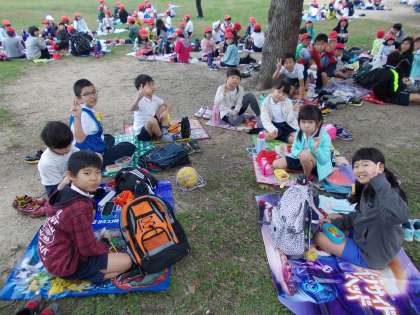 10月24日(火)全校遠足で鶴見緑地に行ってきました。大芝生広場周辺で、たてわり班に分かれてオリエンテーリングを楽しみました。この日が前期たてわり班での最後の活動になりました。地図を手掛かりに7個のポイントを班で協力して回りました。それぞれのポイントでは、先生たちが考えたゲームがあり、高得点を目指してどの班もがんばっていました。1位から3位までは表彰があります。また、協力して仲良く活動していた班にはチームワーク賞があります。どの班が選ばれるか楽しみですね。