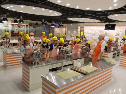 そのあとは、楽しみにしていた「チキンラーメン」を手作りできる2階の体験工房に行きました。小麦粉をこね、のばし、蒸した後に味付けをし、「瞬間油熱乾燥法」で乾燥するまでを体験しました。