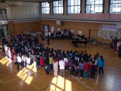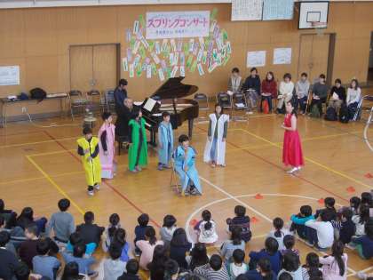 3月2日(金)5時間目、ピアニストの寺嶋陸也さんとソプラノ歌手の中嶋康子さんをお迎えして、スプリングコンサートを実施しました。講堂中に広がるソプラノの歌声や迫力のあるピアノの演奏にみんな引き込まれていきました。また、音楽の時間に学習してきた「森は生きている」の歌をみんなで楽しく歌うことができました。心温まる素敵なコンサートになりました。