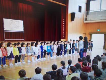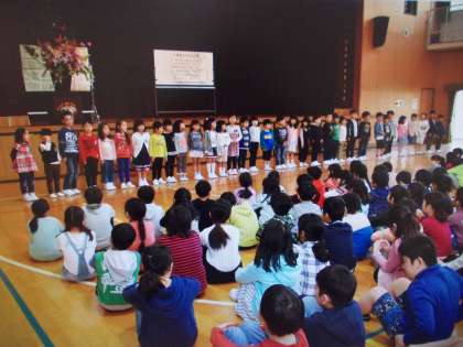 始業式の後、新1年生のと対面式を行いました。高学年代表児童が作る花のアーチをくぐって、1年生が2〜6年生の前に登場しました。少し緊張しているようでしたが、6年生の「歓迎のことば」の後、大きな声で「よろしくお願いします」と言うことができました。