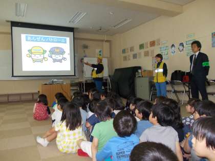 4月24日(火)、天王寺区役所の安全パトロールの方と天王寺警察の方による安全教室が行われました。不審者に声をかけられた時に自分の身を守るための5つのやくそくや、登下校などでの安全な行き方などについて教えていただきました。クイズも交えながらしっかり考え、楽しく学ぶことができました。日頃から安全な道を通ることや、信号は右左をしっかり確認することなど、ご家庭でも安全についてしっかり話し合っていただければと思います。配布しました防犯ブザーや防犯笛もご活用ください。