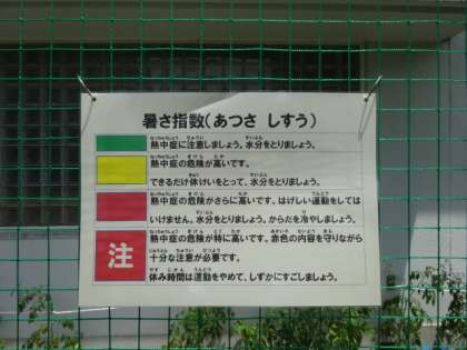 味原小学校では、熱中症を防ぐ対策として、環境省が算出した暑さ指数を掲示し、児童・教職員・来校者の方々へ注意喚起を行っています。活動中もこまめに水分補給をしたり、ミストを使用したりするなどの対策を行っています。