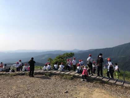 高丸山の山頂に到着しました!各学年ごとに集合写真を撮り、ゆっくり休憩しています。心地よい風が吹いており、山頂からの景色は最高です。