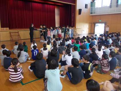 10月22日(月)の全校朝会で、全校遠足オリエンテーリングの表彰式を行いました。優勝は50点で黄の2班でした。準優勝は49点で赤の4班でした。第3位は48点で緑の2班でした。1点差のきわどい結果でした。そして、班のみんなと仲良く協力してポイントを回っていた「チームワーク賞」は、赤の3班、青の5班、黄の1班でした。校長先生から賞状をいただきました。