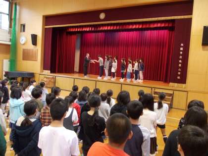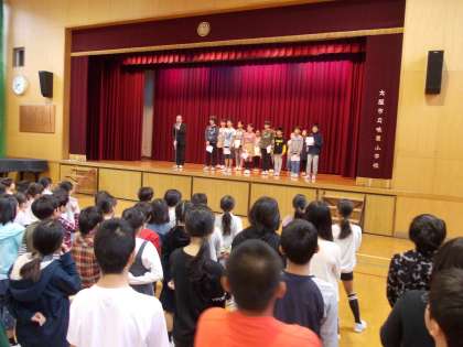 10月29日(月)全校朝会で前期児童会メンバーの表彰がありました。半年間、味原小学校をよりよくするために一生懸命活動することができました。毎朝玄関に立って登校してくる友達に元気よく「おはようございます」とハイタッチであいさつしている姿が印象的でした。