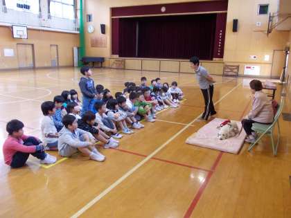 盲導犬の役割や日常生活の様子を教えていただき、山本さんご自身が水泳や卓球、バレーボールなどのスポーツをしていた時の様子や、料理をしている様子のDVDをみせていただきました。その後実際に校内を山本さんがフェリシアと歩く様子を見せていただきました。階段の前では一旦停止するところを見てみんな感心していました。