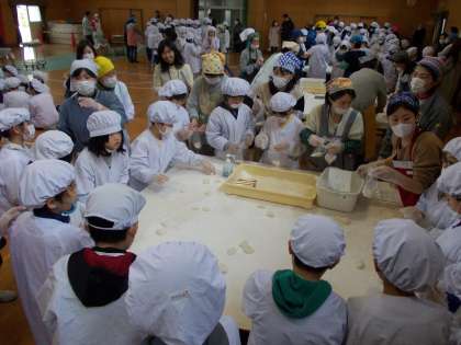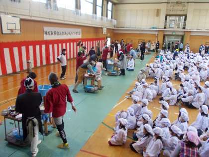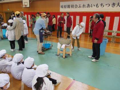 学習参観後、全校児童が体育館に集合し、餅つきを楽しみました。学年ごとに分かれ、一人5回ずつでしたが、全員餅をつくことができました。頑張って餅をついている友達に「よいしょ、よいしょ」の掛け声をみんなでかけて励ましていました。
