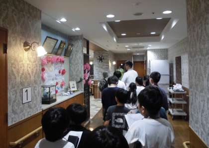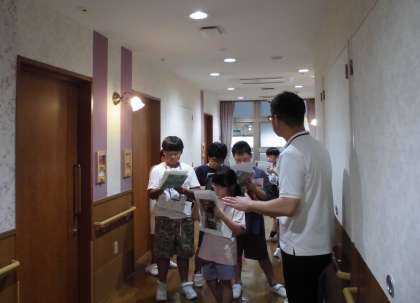 総合の学習で、高齢者施設「そんぽの家」に見学に行きました。高齢者施設というものがどのようなものかほとんど知らなかった4年生にとって、施設にあるもの全てが新鮮でした。車いすに乗ったまま全身をきれいにしてくれるお風呂や、安全に配慮した居室など高齢者施設の様々な工夫を知ることできました。