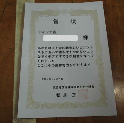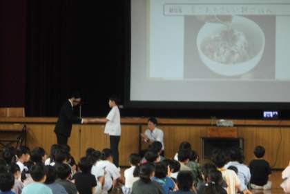 朝食レシピコンテストの表彰がありました。味原小学校からは、7名が入賞しました。