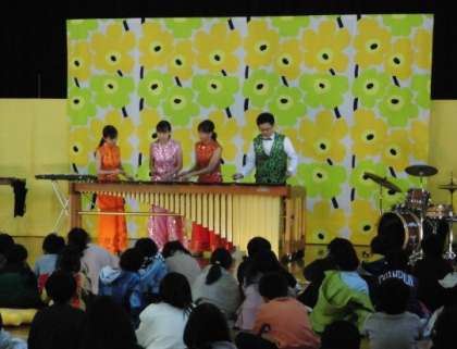 今年度は、マリンバカンパニーの皆さんに来ていただき、「世界の音楽」と題してマリンバの演奏をしていただきました。4人並んで演奏するほど長いマリンバには、様々な種類のマレットが使われていました。同じ楽器を演奏しているのに、マレットを変えるだけで音がすっかり変わってしまう不思議な体験もできました。素敵な演奏をありがとうございました!