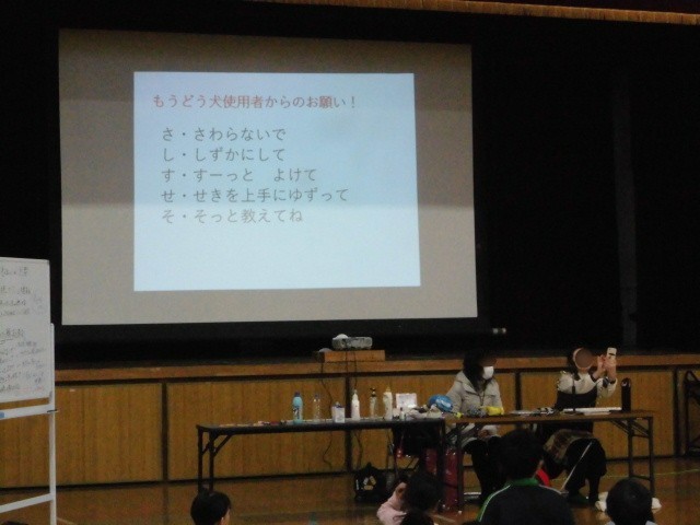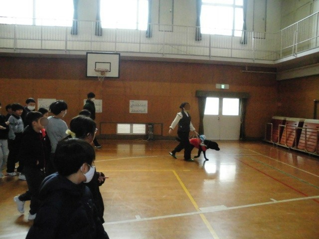 総合的な学習の時間に「福祉」について学習をしている4年生が、盲導犬のメモちゃんと利用者の方との交流をしました。実際に歩く様子を見せていただくと、「ストップ」「ドア」などの声にしっかり反応して、利用者さんの安全を守っていました。また、盲導犬だけでなく様々なアプリも活用していることも教えていただきました。