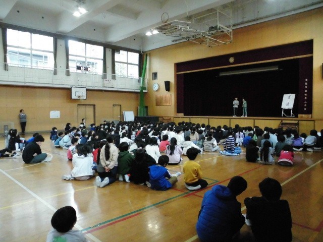 この時間を楽しみにしていた子どもたち、1年生から6年生までたくさんのお客さんが集まり、講堂中に大きな笑い声が響き渡りました!!