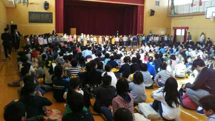 ※写真は、在校生と新1年生との「対面式」の様子です。6年生の代表児童が、しっかりとお迎えの言葉を言ってくれました。