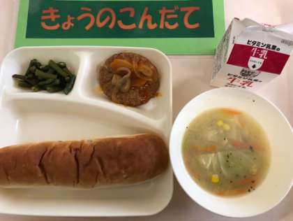 今日の献立 ●煮込みハンバーグ ●コーンスープ ●さんどまめのサラダ ●おさつパン ●牛乳
