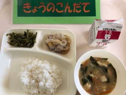 今日の献立 ●豚肉のおろしじょうゆかけ ●みそ汁 ●じゃこピーマン ●ごはん ●牛乳