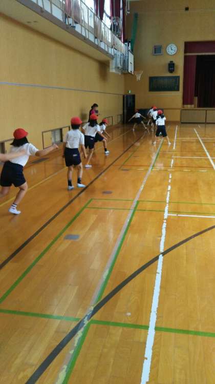 3年生が、体育館で反復横跳びの回数を測定していました。