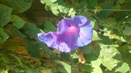 家の庭のツルに小さく、でもたくさん咲いたアサガオをお母さんと