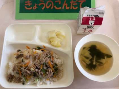 今日の献立 ●豚丼 ●湯葉のすまし汁 ●焼きじゃが ●牛乳